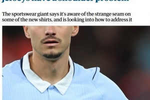 耐克在給《衛報》的一份聲明中承認了球衣肩部設計問題,并表示正在研究可能的解決方案:“在最近的國際比賽期間,我們注意到我們的國家隊球衣在肩縫處存在一個小問題。雖然不影響球衣性能,但整體外觀沒有達到應有的標準?!?/p>
