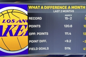 三月湖人的戰績是15勝2負,場均得到120.6分,失分111.4,凈勝分+9.2,命中率51%;