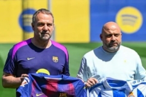 合影在巴薩一線隊訓練結束后,于比拉諾瓦球場的草坪上進行,兩人在鏡頭前展現出十分融洽的氛圍。在合影尾聲,弗里克還像往常一樣展示了自己挑選的球衣,印有6號的加維球衣,并詢問對方穿的是哪件。馬諾洛隨即亮出了西班牙人藍白條紋、印有傳奇球員達尼?哈爾克21號的球衣。