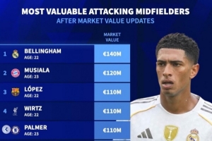體育資訊4月11日訊 《轉(zhuǎn)會(huì)市場(chǎng)》統(tǒng)計(jì)了前腰位置球員身價(jià)情況,貝林厄姆力壓穆西亞拉居首。