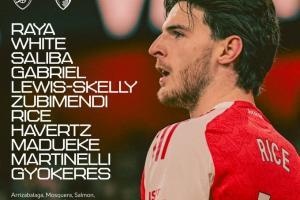 阿森納首發:1-拉亞、4-本·懷特、2-薩利巴、6-加布里埃爾、49-斯凱利、36-蘇維門迪、41-賴斯、29-哈弗茨、20-馬杜埃凱、11-馬丁內利、14-約克雷斯