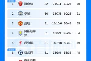 體育資訊04月11日訊 英超第32輪結束一場較量,阿森納主場1-2負于伯恩茅斯,多賽兩場對曼城的領先優勢仍為9分,曼城將在明晚23點30客場對陣切爾西;完整英超積分榜如下。