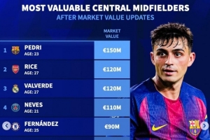 體育資訊4月11日訊 《轉(zhuǎn)會(huì)市場(chǎng)》統(tǒng)計(jì)了中前衛(wèi)位置球員身價(jià)情況,佩德里等4人身價(jià)均超過(guò)1億歐元。