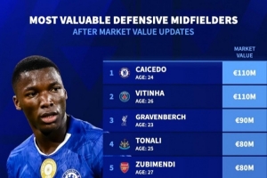 體育資訊4月11日訊 德國轉會市場列出了防守型中場(DM)德轉身價排名,凱塞多、維蒂尼亞1.1億歐居首。