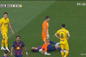比賽第37分鐘,西班牙人的一次進攻,巴薩中衛馬丁突然痛苦倒地。但隨后他在隊醫的處理后看起來問題不大,回到了比賽。