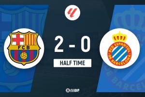 上半場補(bǔ)時(shí)3分鐘,巴薩2-0西班牙人。