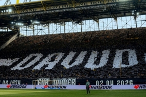在對陣?yán)瘴謳焐谋荣愔埃嗵啬峡磁_球迷展示TIFO,致敬已故的多特俱樂部工作人員達(dá)烏德·穆罕默德。