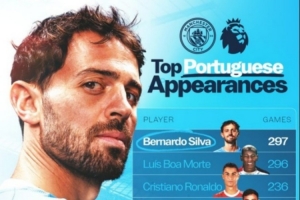 體育資訊4月12日訊 本輪英超將迎來焦點戰曼城對陣切爾西,B席本場首發出場,這是他第297次英超出場,創造了葡萄牙球員在該項賽事歷史紀錄,以下為具體榜單: