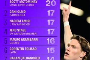 體育資訊4月14日訊 數(shù)據(jù)機(jī)構(gòu)squawka統(tǒng)計(jì)了上賽季至今的五大聯(lián)賽中前衛(wèi)進(jìn)球榜,麥克托米奈居首。