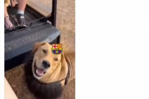 其中,一只獅子被加上了巴薩隊徽,跑到帶著馬競隊徽的人身前,被薅下頭套,下面是條狗。