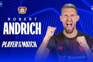 體育資訊3月12日訊 歐冠1/8決賽首回合,勒沃庫森主場1-1戰平阿森納,安德里希首發出戰,賽后被評為全場最佳。
