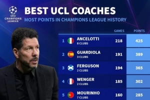 體育資訊4月15日訊 德國轉會市場列出了歐冠主帥積分榜,安切洛蒂、瓜迪奧拉、弗格森前三,西蒙尼第六。