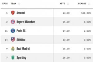 Opta超算給出了最新的歐冠奪冠概率,目前阿森納34.34%居首,拜仁第二,巴黎和馬競分列三四,皇馬僅3.48%位居第五。