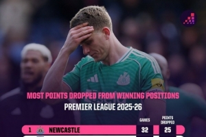 本賽季英超領(lǐng)先情況下丟分榜:紐卡25分最多 切爾西19分 曼聯(lián)16分