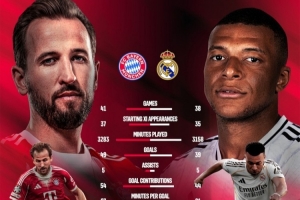 體育資訊4月15日訊 北京時間明天凌晨,拜仁將在歐冠1/4決賽次回合比賽中主場對陣皇馬,首回合拜仁2-1取勝。拜仁官方社媒曬出了凱恩、姆巴佩本賽季的數(shù)據(jù)。