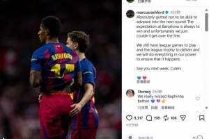 體育資訊4月15日訊 在歐冠1/4決賽,巴薩總比分2-3被馬競淘汰,拉什福德也在個人社媒發文談到自己的感受。