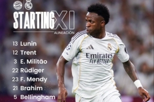 皇馬首發(fā):13-盧寧、12-阿諾德、3-米利唐、22-呂迪格、23-費蘭·門迪、21-布拉欣·迪亞斯、5-貝林厄姆、8-巴爾韋德、15-居萊爾、10-姆巴佩、7-維尼修斯