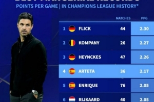 體育資訊4月16日訊 在歐冠淘汰賽次回合,阿森納0-0戰平葡體,總比分1-0晉級。以下為歐冠歷史主帥場均積分榜(至少執教25場):