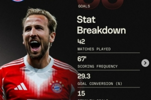體育資訊4月16日訊 在歐冠淘汰賽次回合拜仁4-3擊敗皇馬的比賽中,凱恩破門,打進(jìn)個(gè)人本賽季各項(xiàng)賽事第50球。