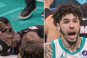 在昨日黃蜂戰勝熱火的附加賽上半場,拉梅洛·鮑爾倒地后手臂掃到了阿德巴約的腳踝,導致后者受傷退賽。