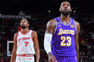 本輪火箭與湖人的系列賽,最動人的主線莫過于詹姆斯與杜蘭特的對決。