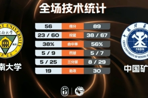 末節中國礦大延續狀態,他們開局三個回合全部達成上來就是一波6-1的攻勢繼續擴大領先,隨后東南大學雖然進攻端反撲,但場面優勢不大且巨大分差之下難以制造威脅,末段寧吉桐命中三分穩穩保持大比分優勢。最終,中國礦大89-56輕取東南大學進入八強。