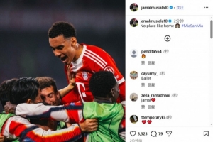 拜仁中場穆西亞拉在社交媒體曬出與隊友一起慶祝的照片,分享了晉級的喜悅,并配文寫道:“沒有比主場更好的地方了。”