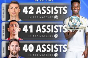 體育資訊04月16日訊 歐冠1/4決賽次回合,皇馬3-4總比分4-6不敵拜仁被淘汰,維尼修斯助攻姆巴佩破門(mén),據(jù)統(tǒng)計(jì)這是維尼修斯在歐冠的第31次助攻,升至歷史第5。