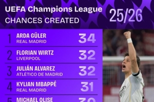 體育資訊4月16日訊 Squawka統計了本賽季歐冠球員創造機會的次數,并列出榜單,居萊爾34次居首。