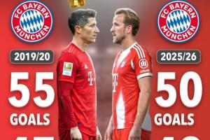 本賽季凱恩代表拜仁出戰(zhàn)42場比賽,已經(jīng)貢獻50粒進球和6次助攻,距離萊萬在拜仁的最佳賽季2019/20賽季創(chuàng)下的47場55球還有5球。