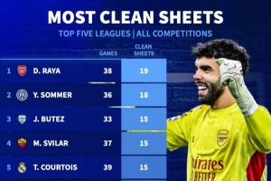 數據統計顯示,本賽季歐洲五大聯賽門將中,拉亞各項賽事出戰38場比賽,有19場零封,零封場次最多。