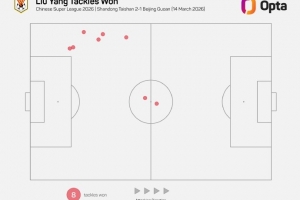 8 - 劉洋本場比賽有8次成功搶斷,刷新自2012年Opta采集相關數據以來,山東泰山球員單場中超新高。
