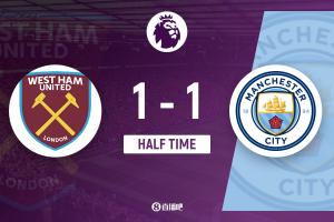 上半場傷停補時2分鐘,半場結束,曼城暫1-1西漢姆聯(lián)。
