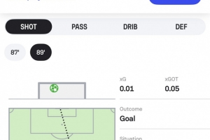 數(shù)據(jù)網(wǎng)站Sofascore曬出居萊爾射門路線圖,并調(diào)侃道:“我們可能需要重新設(shè)計球員的射門路線圖了,因?yàn)榘雸鰣D已經(jīng)放不下這腳吊射了。”