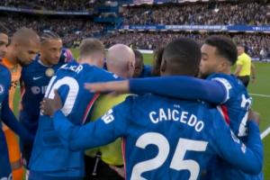 英超第30輪,切爾西vs紐卡,切爾西球員賽前圍圈把主裁保羅·蒂爾尼圍住,帕爾默抱裁判+盯著看。