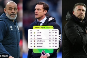 本輪英超在積分榜后6位的球隊中,有5隊都拿到1分(狼隊還未賽),其中利茲聯0-0戰平水晶宮,諾丁漢森林0-0戰平富勒姆,西漢姆1-1戰平曼城,伯恩利0-0戰平伯恩茅斯。