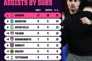 體育資訊3月17日訊 Opta統(tǒng)計了2025/26賽季英超聯(lián)賽中,各隊(duì)替補(bǔ)球員貢獻(xiàn)的進(jìn)球和助攻數(shù)據(jù),阿森納位列第一。