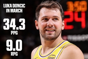 東契奇三月場均砍下34.3分9.0籃板7.7助攻,帶領球隊取得8勝1負的戰績。