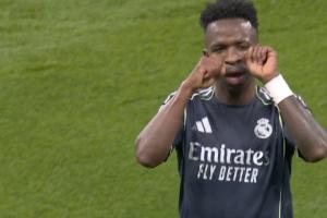 維尼修斯點射破門后做哭臉慶祝動作,扶著角旗桿擺pose。