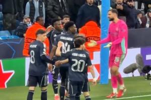 維尼修斯補(bǔ)時(shí)上演梅開二度后,對著球迷展示球衣。隨后曼城門將多納魯馬攤手與其溝通表達(dá)不滿。