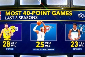 近3季40+排名:東契奇28場(21勝7負)、亞歷山大25場(22勝3負)、華子23場(16勝7負)