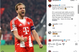 凱恩社媒曬出慶祝進球的照片,配文:“四分之一決賽,我們來了!安聯球場的精彩夜晚!”